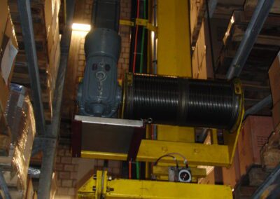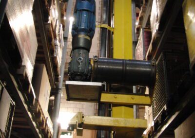 Das RBG (Regalbediengerät) wird von einem Fahrer in der Kabine bedient. So lagert er die Paletten von drei Übergabepositionen im Hochregallager ein und aus.